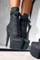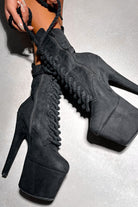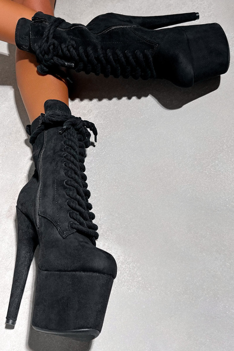 • Lux Black Faux Seude Exterior | Plush Breathable Interior Lining |  Matching Thick Rope Laces  |  Pointe-Friendly Platforms | Designed for an Arched Aesthetic | No Grip for the Pole
