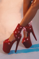 Lush Red Sparkles, Pink Glittery Heart Cutouts sealed with Pink Ribbon Shoelaces