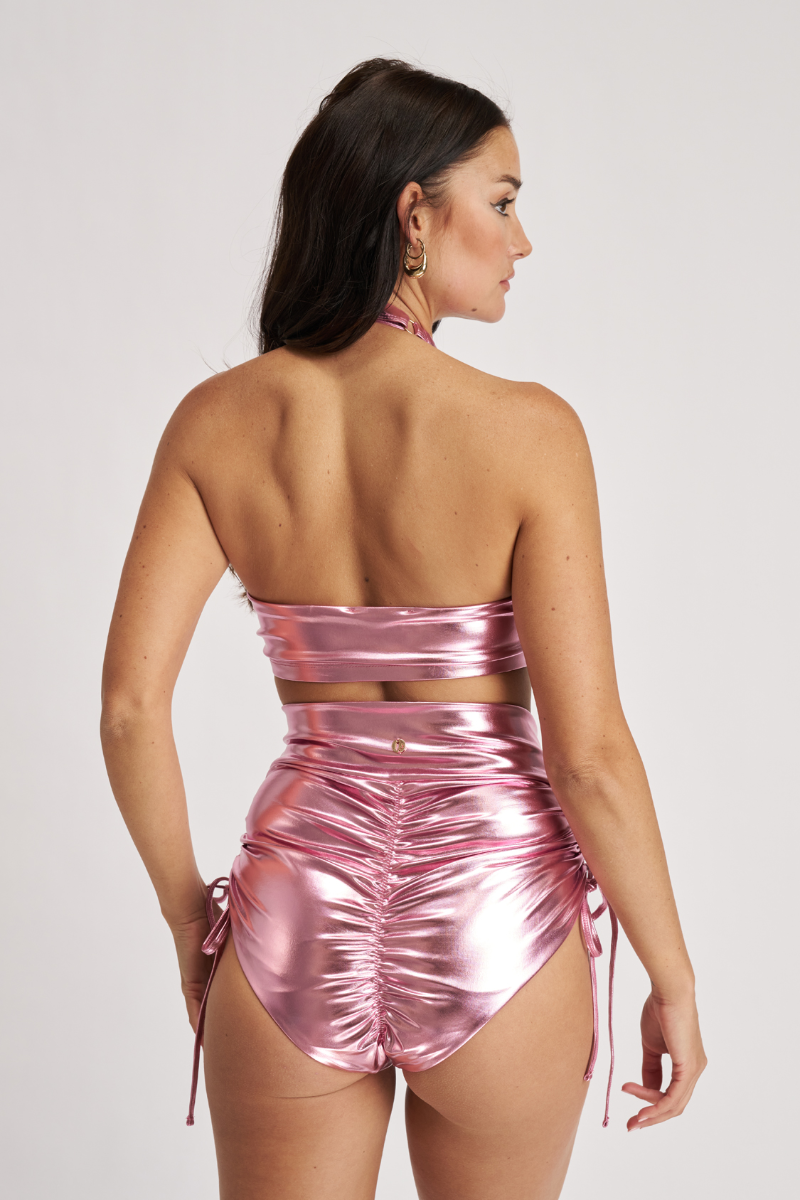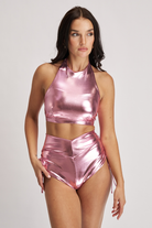 Serve a look from a parallel universe. This metallic baby pink top from Lunalae's Intergalactic collection offers stellar support with its high-neck halter design and fuller coverage. Turn around to reveal the dramatic open back. It's business in the front, party in the back-of-the-spaceship.