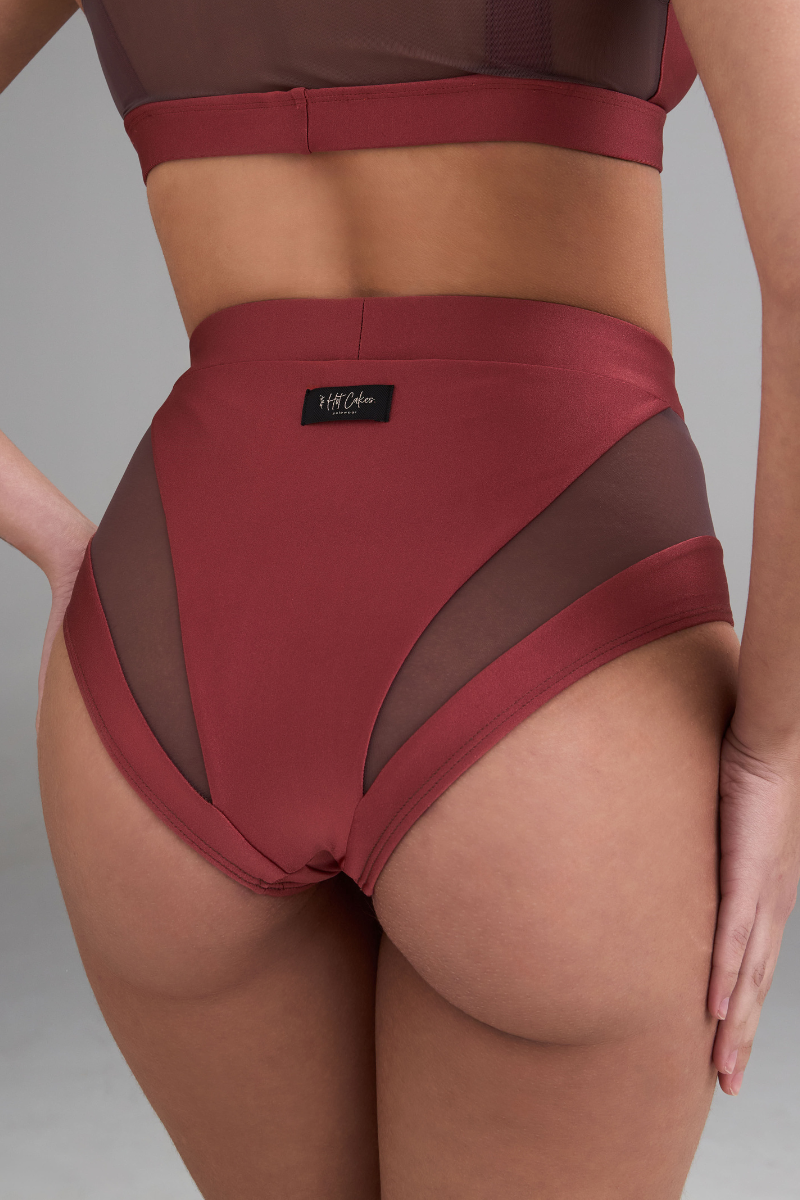 These high-waisted beauties in rich, dark burgundy are designed to flatter and command attention. The bold black mesh cutouts add a seductive edge, like whispers of shadows long forgotten, reminiscent of a tale from Greek mythology. Step into your power and own the stage—just like Echidna you are a force to be reckoned with.