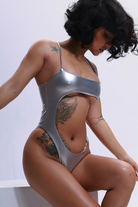 Drip in liquid moonlight. This silver metallic bodysuit is architectural chaos in the best way possible. With an asymmetric cut connecting top to bottom on just one side, it defies gravity and convention. The open stomach, low-rise front, and super cheeky cut serve serious skin, while adjustable straps keep the rebellion secure. Reflect every gaze, own every angle.