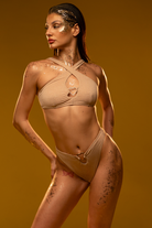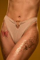 These mid-rise shorts are pure liquid starlight, woven from shimmering gold glitter. The high-leg, cheeky cut is designed to make you feel divine, while a nickel-free heart detail offers a sweet, celestial wink. A heavenly look for owning your glow.