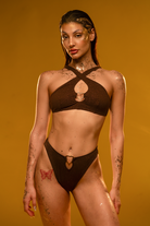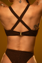 Radiate goddess energy. ✨ This bronze glitter top transforms with you—cross the straps at the front for a halter or back for a scoop. Lined and padding-free for a natural fit, it offers fuller coverage and a sweet heart detail. A versatile slice of heaven.