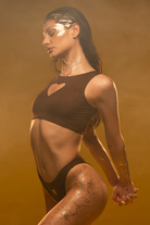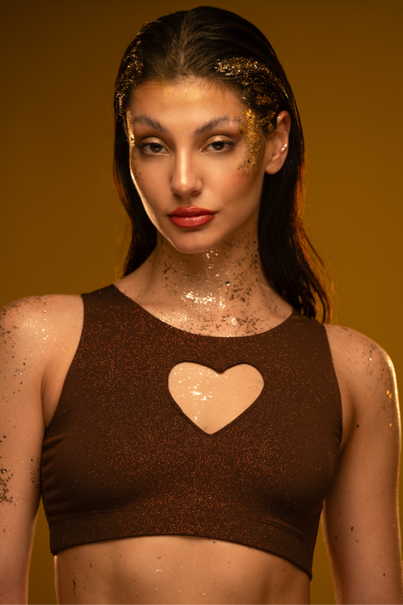 Glow like a divine being. This high-neck top offers sophisticated, fuller coverage with a regular support fit. Lined and padding-free, the bronze glitter fabric captures starlight with every spin. The playful tulle heart cut-out adds a cheeky wink to an otherwise celestial silhouette. Shine on, goddess. ✨