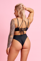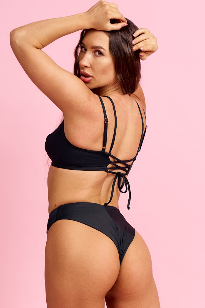 Fairy or Goddess? Choose your perfect cup match for a fit that truly celebrates your shape. This black essential masters the art of illusion with sheer mesh support and a fully customisable lace-up back. With secure double straps and a glint of gold hardware, it’s structured, sexy, and ready to command.