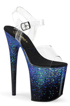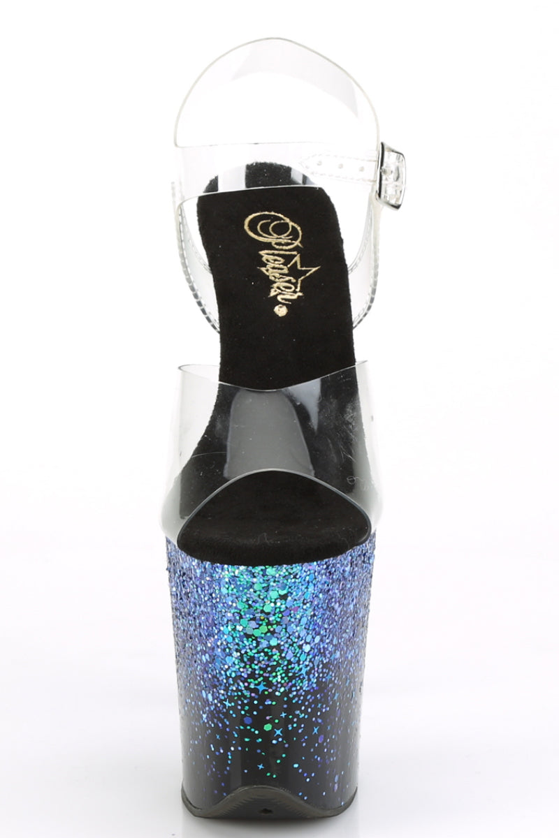 Dare to shimmer in the Pleaser USA Flamingo-808SS 8inch Pleasers - Black/Blue Glitter; an 8-inch heel and 4-inch platform adorned with holographic and ombre glitter. These heels are your declaration of strength and sparkle on the dance floor.💃🤩