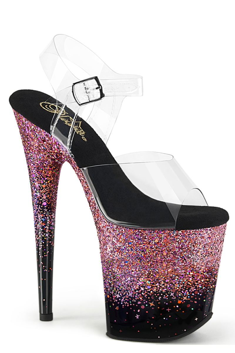 Dare to shimmer in the Pleaser USA Flamingo-808SS 8inch Pleasers - Black/Pink Glitter; an 8-inch heel and 4-inch platform adorned with holographic and ombre glitter. These heels are your declaration of strength and sparkle on the dance floor.💃🤩