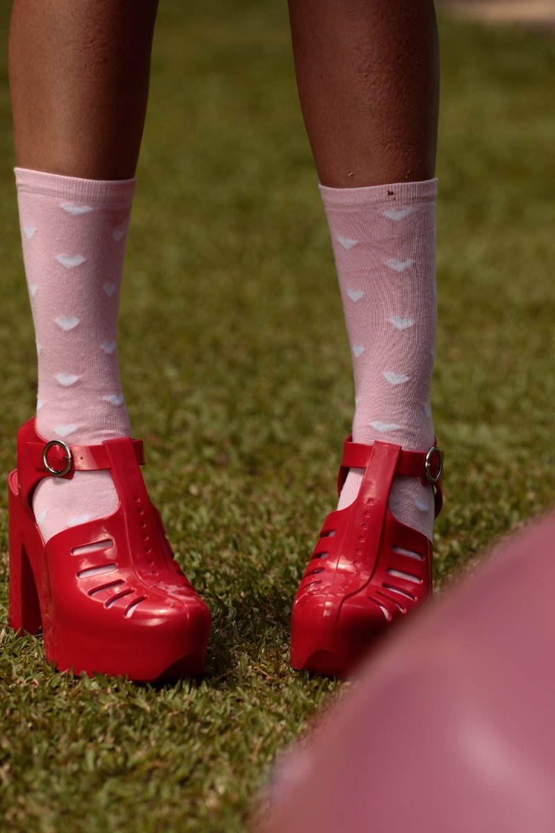 Sweet and sassy, the Rolling Calf High Socks bring playful vibes with white hearts on sweet pink. Perfect for showing off your moves—and your heart.