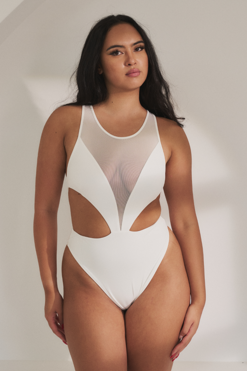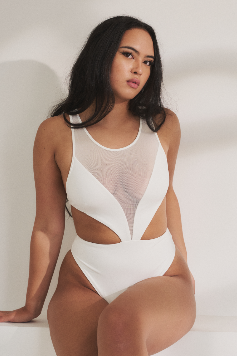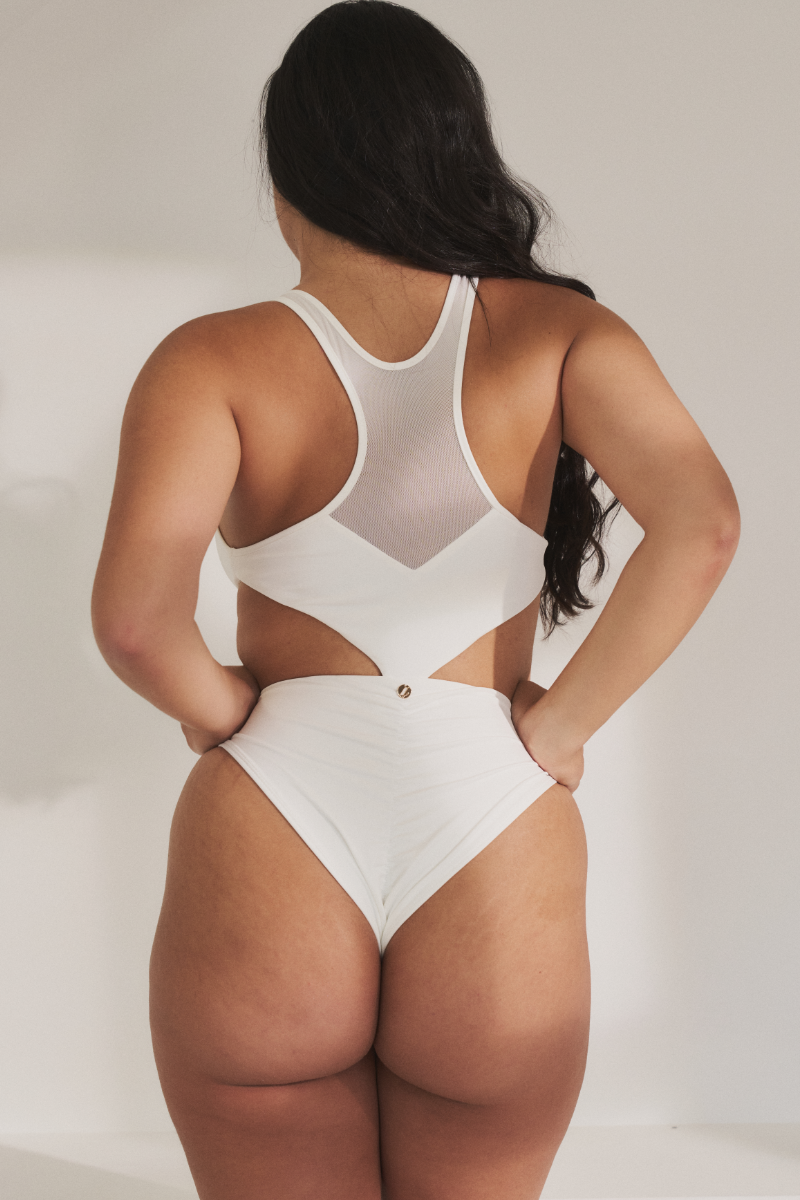 Cut to the chase in crisp white. This cheeky high-leg bodysuit pairs an illusion plunge with open sides for extra grip, a mesh racer back, and scrunch bum shaping that does your curves justice. Finished with signature gold hardware for a little wink on the way out.