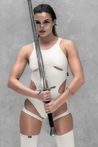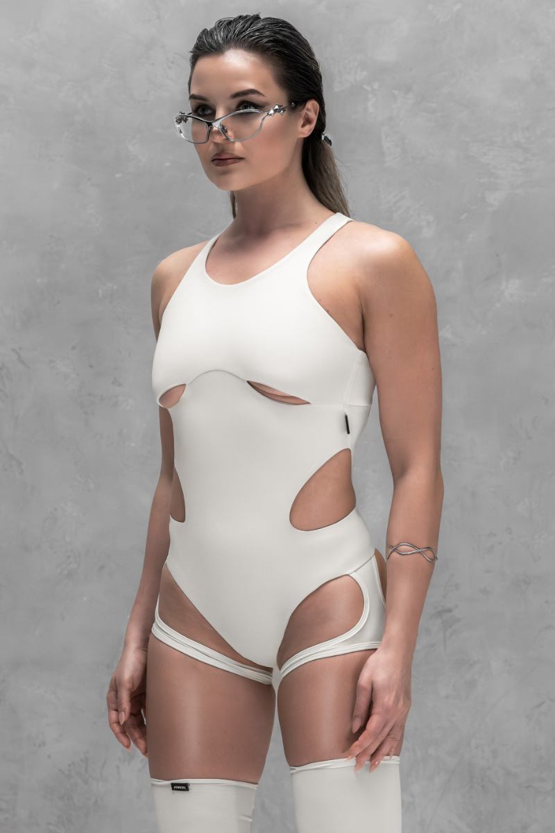 The OBSCURA bodysuit is not just a piece of clothing — it’s a matte milky white lycra armor. Inspired by the concept of a camera obscura, it distorts perception and transforms your body into a bold silhouette.