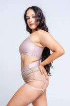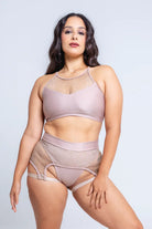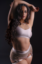 This elegant design combines silky champagne Brazilian lycra with a shimmering fishnet garter belt for a sophisticated high-waisted look. With a cheeky booty cut and adjustable leg garters, these shorts sculpt and lift, ensuring you dazzle on the pole or under the spotlight. Radiate confidence!
