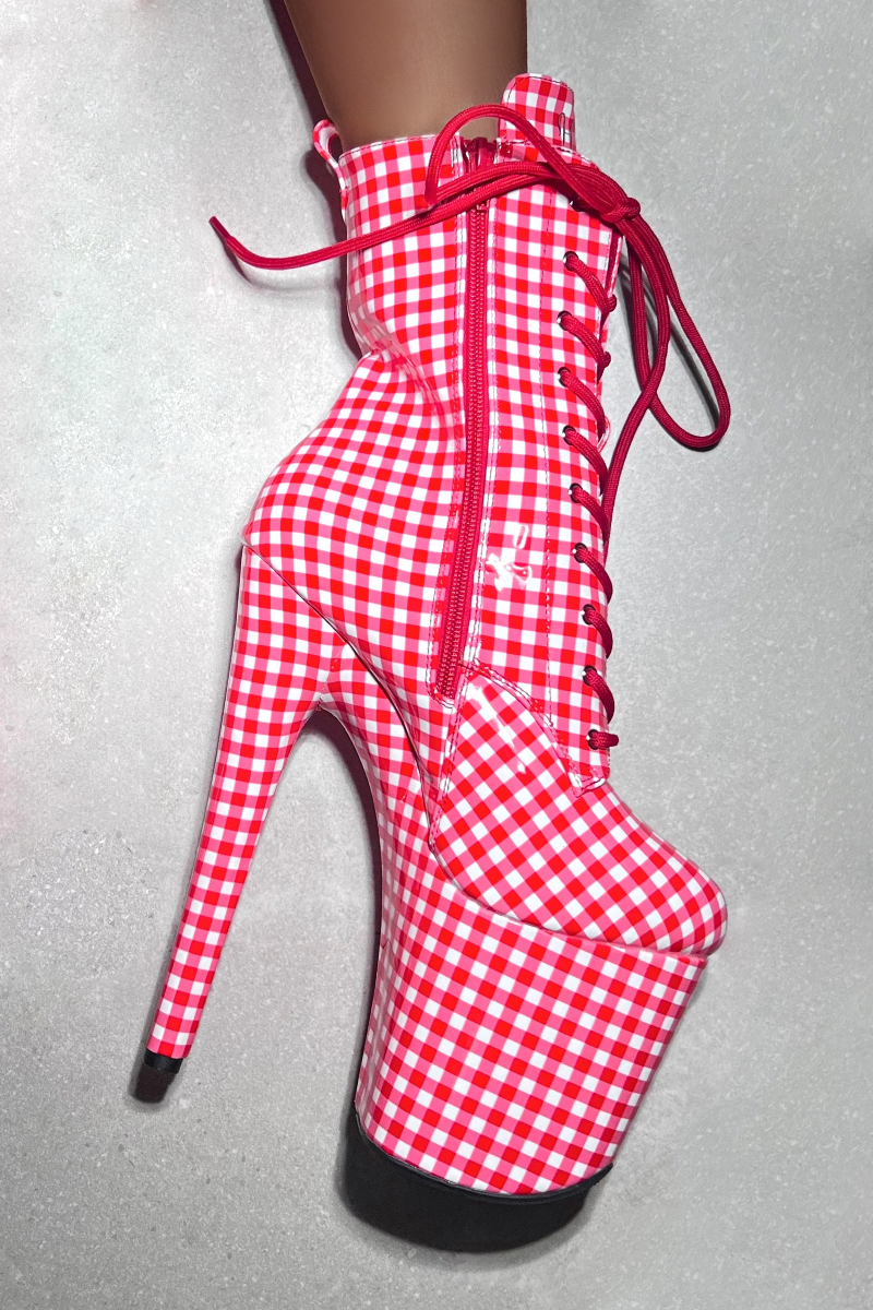 Limited Edition Red Gingham Booties Designed with a custom direct print and matching outfits to complete the full picnic fantasy ✨ 💋 Good girls wear gingham, Baddies wear the full gingham fit - complete the look with Gingham collection
