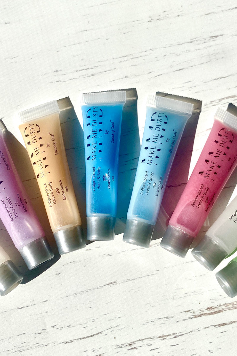 Make Me Dusty is an antiperspirant liquid/gel pole grip specially formulated for normal to sweaty skin. It reduces sweat and assists with grip on the hands and body. It features a delicately scented pearlescent formula that's great for glitter lovers.