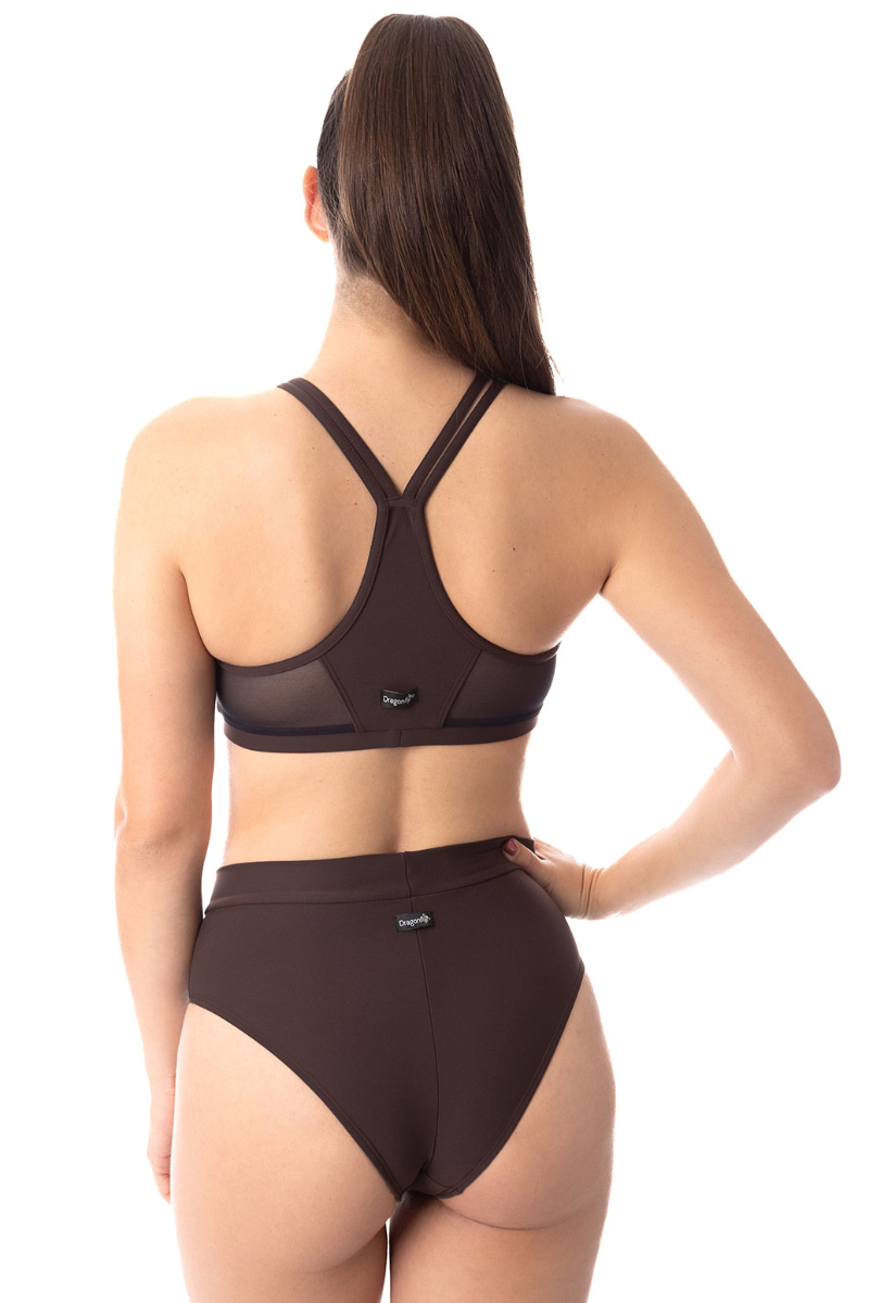 Rich, smooth, and supportive. This high-neck, espresso-brown top provides fuller coverage with a sleek racer back. Crafted from soft, double-lined fabric, it features a sheer mesh V-cut for a hint of drama. A subtle Dragonfly logo on the back completes this studio-to-street essential.