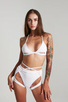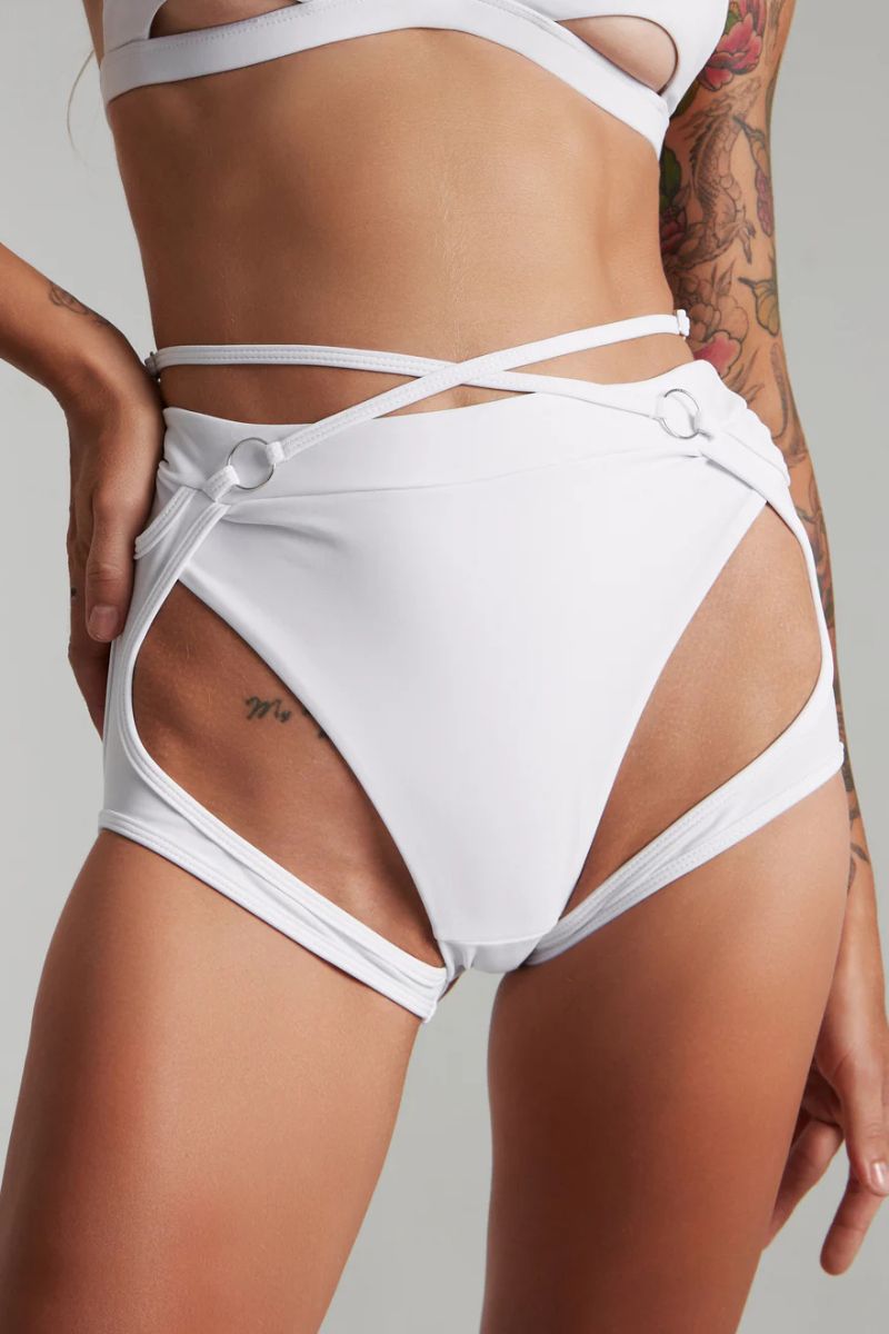 Can you handle the wild purity of the Harna Fantasy Bottoms - White? High-waisted with daring cut-outs and garters, they blend innocence and untamed power. The scrunch bum and silver hardware lure you in, leaving behind nothing but irresistible chaos. As white as an angel, but bold as hell with provocative cut-outs, they’re pure seduction with a wild edge.