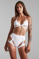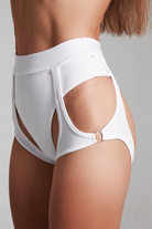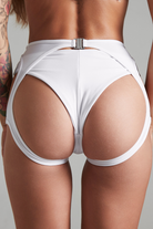 Angelic on the outside, cheeky underneath 🍑. These high-waisted white shorts are your new secret weapon, combining a second-skin fit with a daring cut. Crafted from durable, 4-way stretch fabric, they keep you cool and confident. The main event? Non-removable garters with silver hardware, framing your best asset.