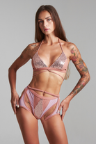 Lightweight mesh, shimmering pink sequins, and moisture-wicking, 4-way stretch fabric provide a second-skin fit. Featuring adjustable, removable garter straps and a cheeky cut, they’re a playful, empowering blend of style and comfort.