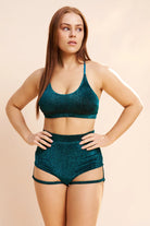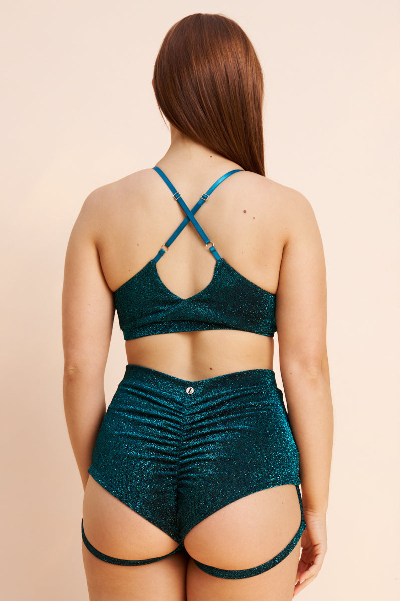 The Athena Top in Ocean Shimmer soaks you in rich teal that is dripping in sparkles like the night sky. With padded cups and adjustable straps, this top ensures full bust coverage and support, empowering you to move confidently while exuding cool sophistication.
