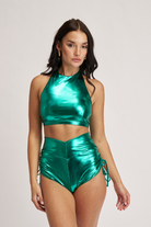Transport your style to another dimension. These metallic turquoise shorts from Lunalae's Intergalactic collection offer a celestial glow. The high-waisted design provides fuller coverage, while the adjustable drawstring sides and signature scrunch bum let you customise your silhouette. Finished with gold hardware for a futuristic feel.