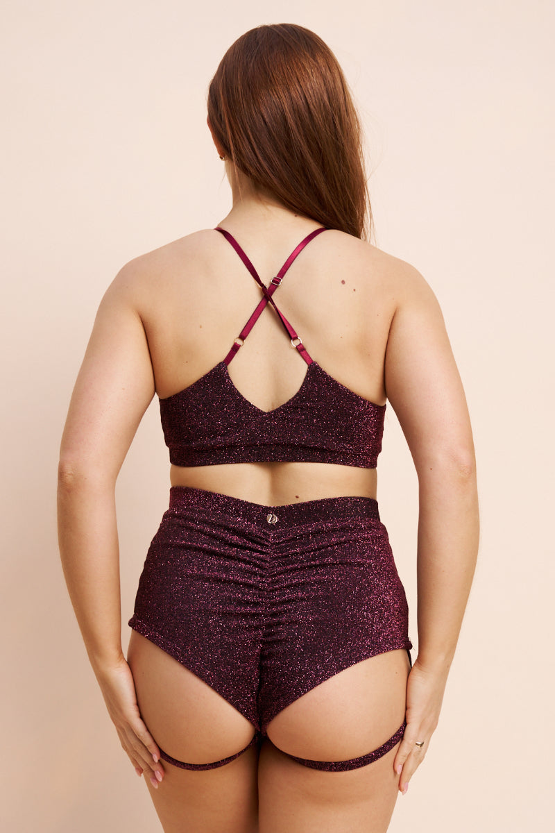 Lunalae’s best settling Lure You Garter Shorts just got a delicious makeover. These deep berry red shorts with shimmering flecks caress your curves, while the scrunch bum and daring garter straps invite the spotlight. Command attention and exude confidence in the studio and on the stage!