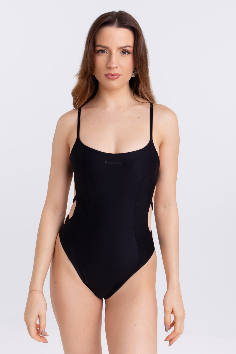 Embrace your dark side. This black bodysuit is a masterpiece of contrasts, crafted from soft, flexible material that feels like a second skin. A modest scoop neck meets an intricate, strappy open back. The high-leg, cheeky cut and signature scrunch bum create a powerful silhouette.