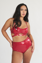 These high-waisted shorts are crafted from a high-shine red PU that moves like liquid heat. Offering full coverage and a flattering scrunch bum, they sculpt a lethal silhouette. Stamped with the signature Lunalae logo, they're designed for dangerous moves and maximum impact.