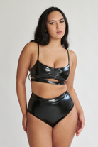 This high-shine black PU top moves like liquid night. A flattering scoop neck, revealing under-bust cut-out, and cute front scrunch create a lethal silhouette. Adjustable straps and non-removable padding offer a comfortable, perfect fit for when you're feeling unapologetically bold.