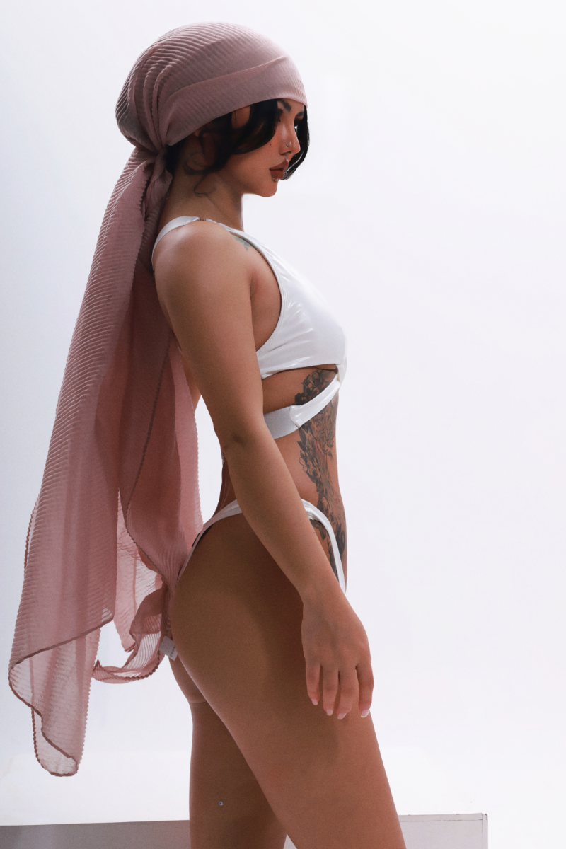 Heaven-sent armour for the modern warrior. This pearl white top gleams with celestial power, featuring a striking cross-wrap front and intricate strappy back. Gold hardware adds a touch of divine detail. Adjustable for a perfect fit, it’s purity with a rebellious streak.