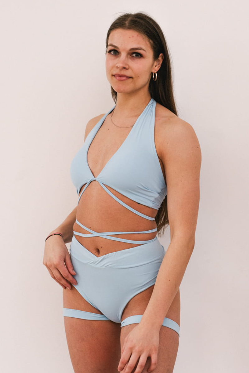 The high-waist V shape and scrunch bum detail create a sleek, sculpted look. Made from buttery-soft fabric with medium coverage and delicate garter accents, the baby blue version adds a fresh, flirty vibe. Swim-proof and versatile.