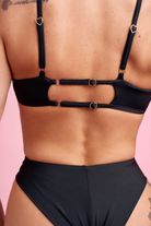 A tapestry of straps and shadows. This bodysuit uses sheer mesh and daring cut-outs to create an unforgettable silhouette. With adjustable straps and gold hardware, you control the fit. A cheeky, high-leg cut with a low waist dares to be different. It’s a statement piece. It’s you.
