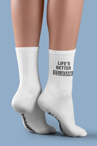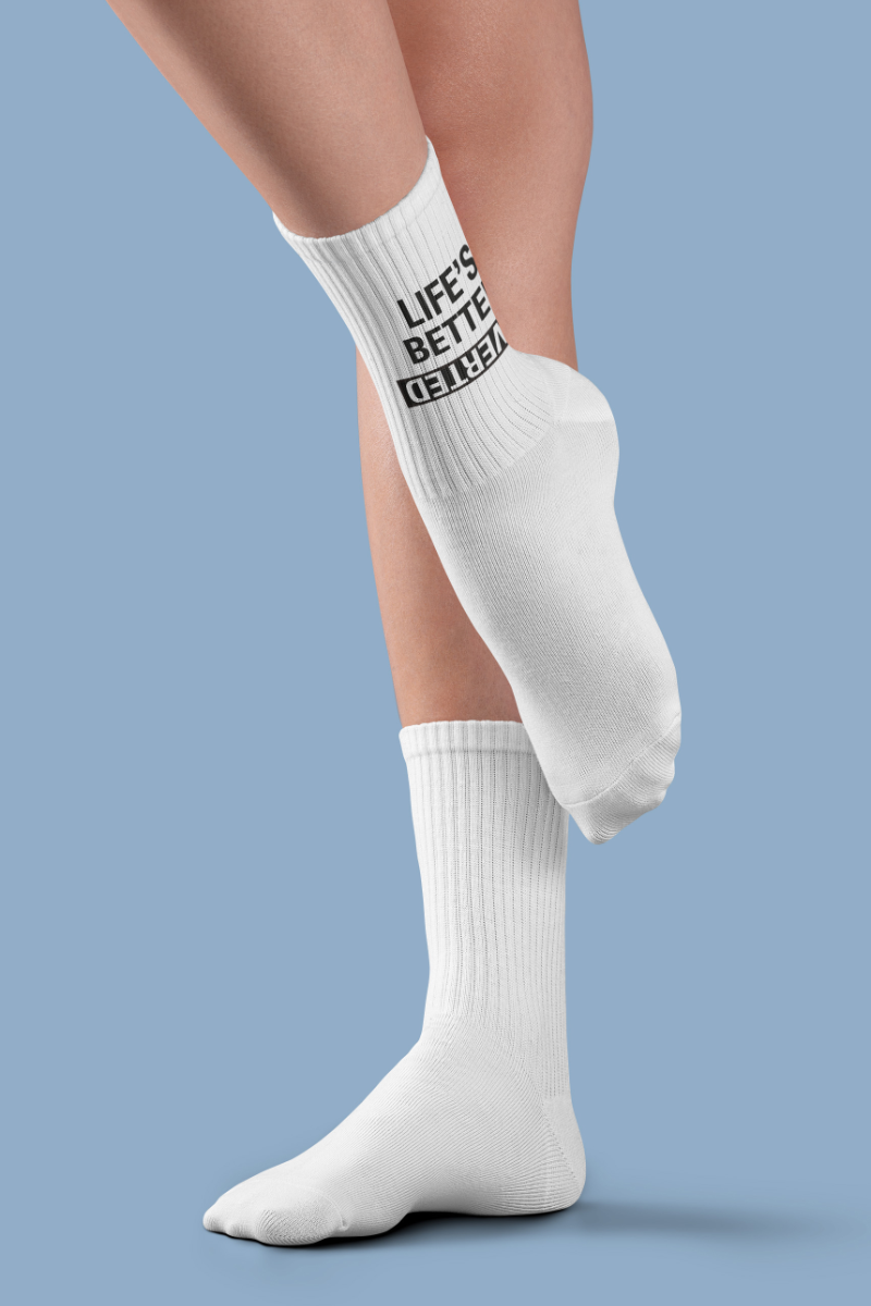 Turn your style upside down with Pole Junkie Inverted Socks - White/Black. Featuring bold letter print, ribbed comfort, and a stretchy fit, these crew socks bring edge and attitude to every step!