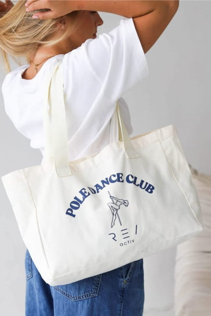 This 100% cotton tote bag is perfect for stashing your studio essentials. Lightweight yet durable, its wide handles make carrying your kit a breeze. Featuring the signature REV Activ logo and an elegant pole dancer silhouette in navy, it’s the stylish way to get to class.