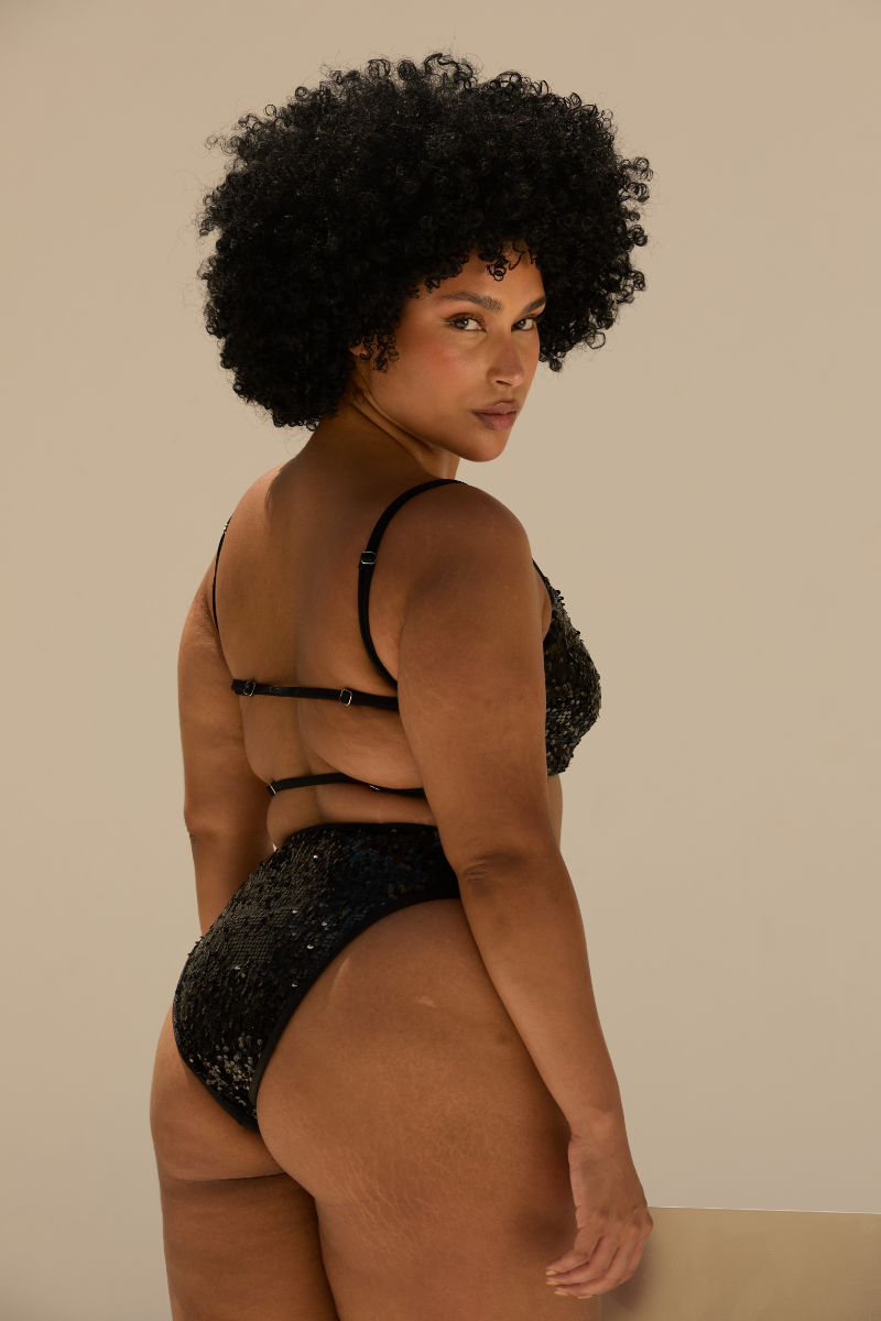 Complete your starlit fantasy. Part of Rolling's Future Nostalgia collection, these high-waisted bottoms are crafted from shimmering black sequins. The high-leg, cheeky cut provides medium coverage for a sculpted, future-proof silhouette. Pair with the matching Sequin Top to create your own constellation.