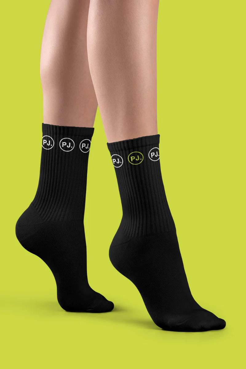 “PJ Circle Logo” Socks: Black socks, green logo, always stay up. Soft and breathable.