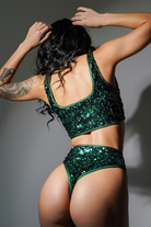 Channel the aurora borealis with these emerald stunners. Cut high on the leg and low on the waist, this barely-there design offers a cheeky glimpse of rebellion. The shimmering sequins catch every stage light, turning your movement into liquid magic. Minimal fabric, maximum attitude.