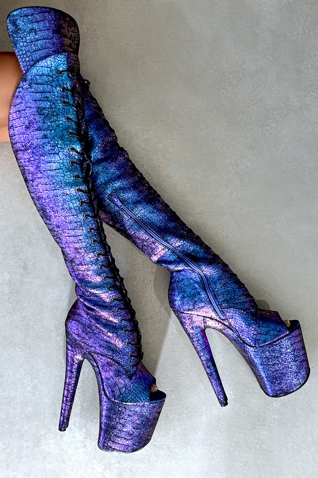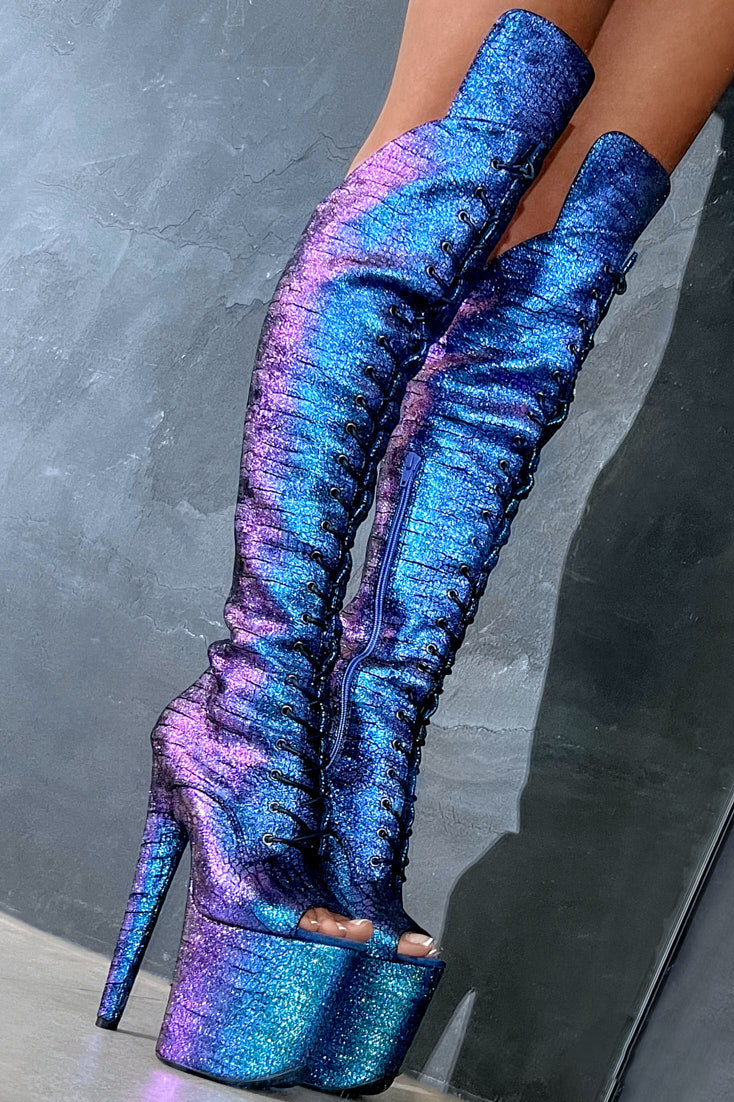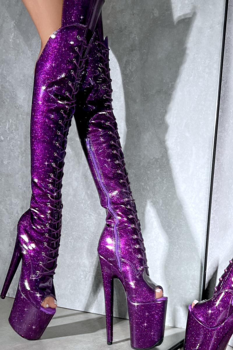 Hella Heels The Glitterati Open Toe Over The Knee 8inch Boots - Purple Rain