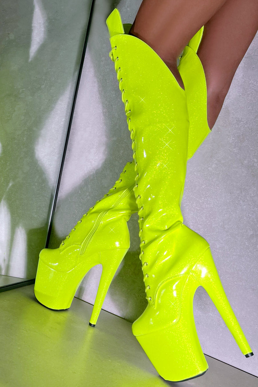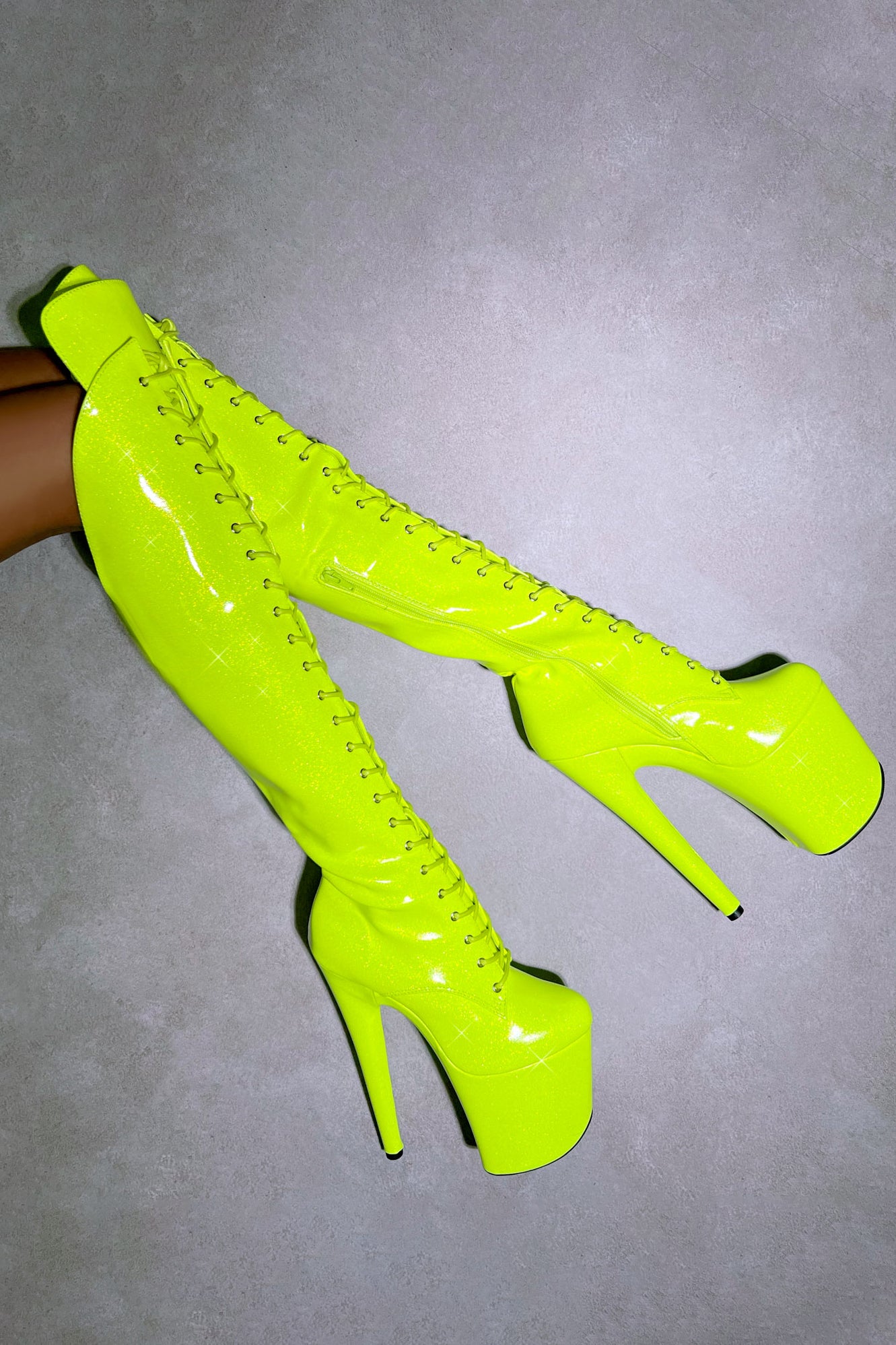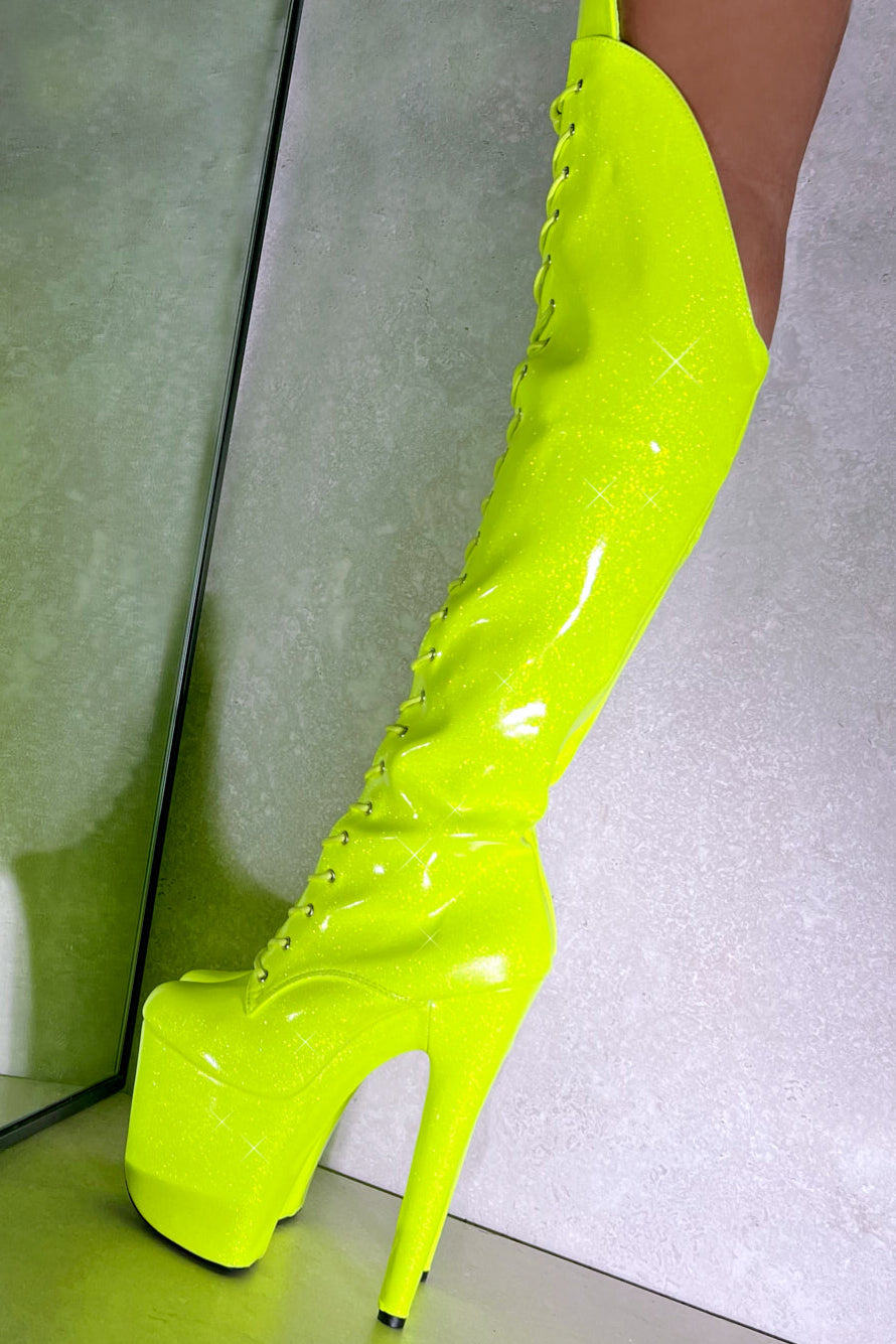 Hella Heels The Glitterati Over The Knee 8inch Boots - Citrus Yellow Burst