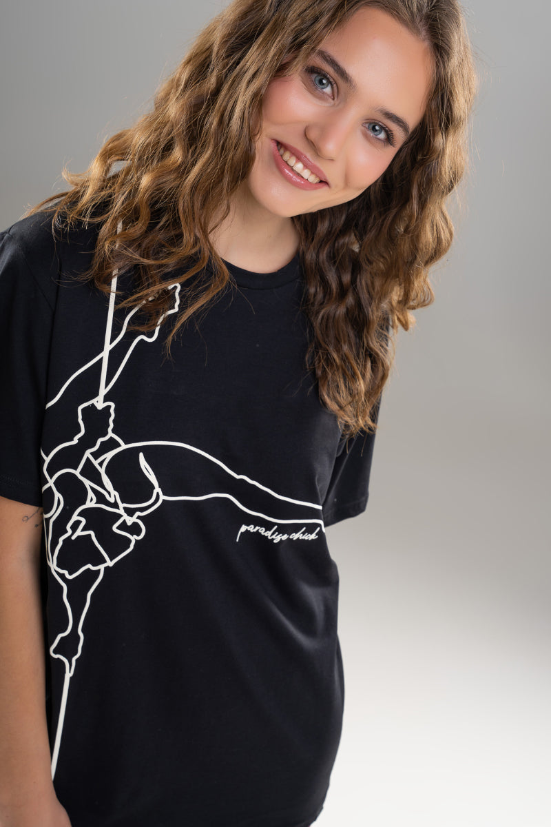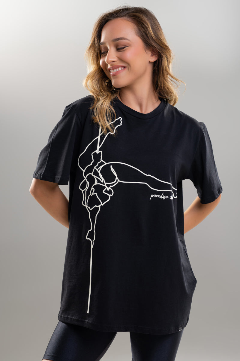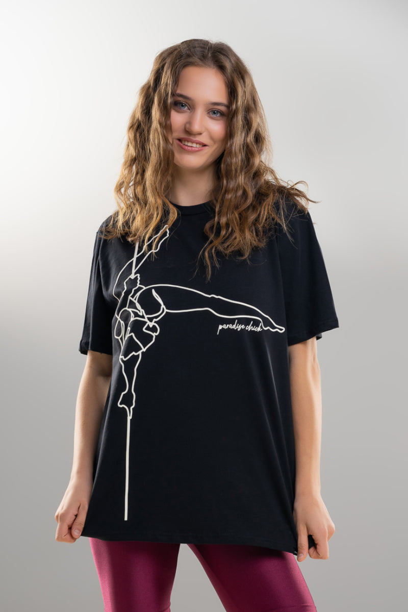A simple black tee to be worn on or off the pole. Featuring inverted pole dancer illustration.