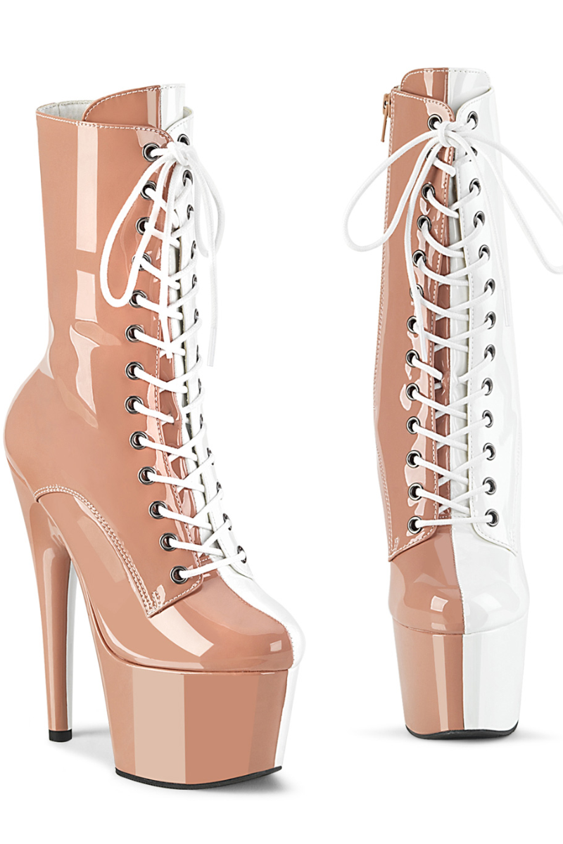 Strut bold in Pleaser USA Adore-1040TT 7inch Pleaser Boots - Patent Blush/White. Dominate in these two-tone lace-up badass Pleaser boots, blending vegan magic with unstoppable style. Lace-up, zip, and conquer with blush power! 🌸✨ Get sassy, stay authentic.