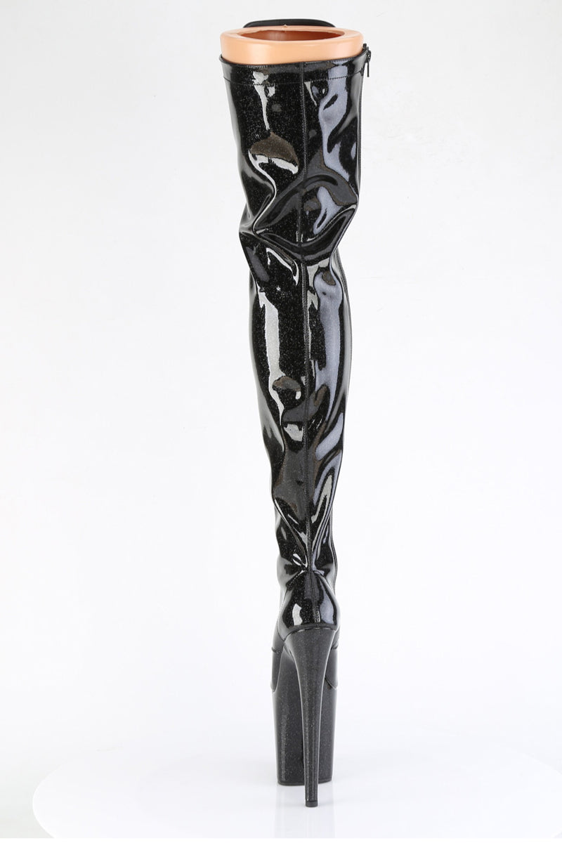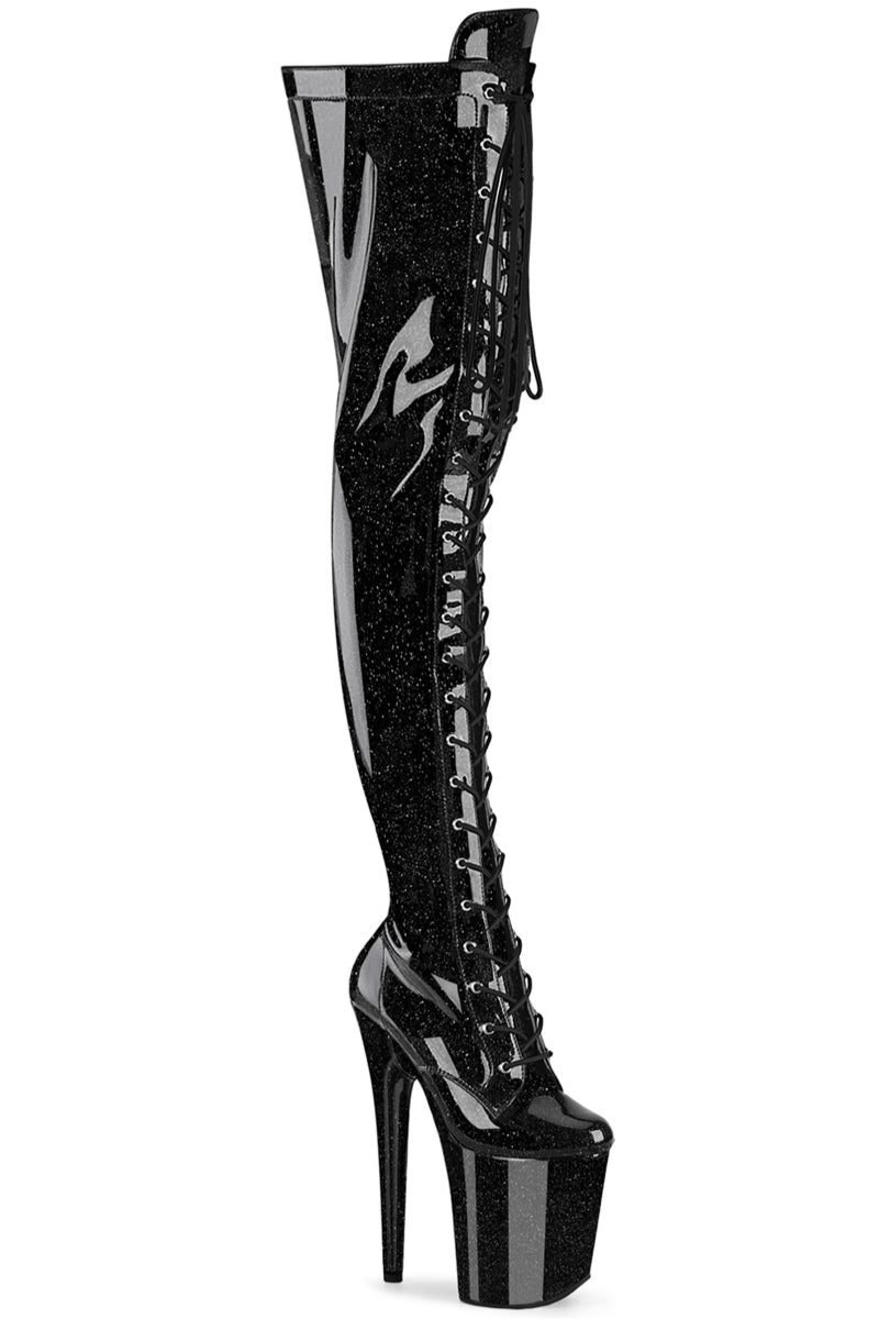 Strut like a goddess in the Flamingo-3020GP thigh-high boots. With their shimmering glitter finish, 8-inch heels, and 4-inch platforms, every step feels like magic. Lace-up fronts and a side zip complete this bold, spellbinding statement.