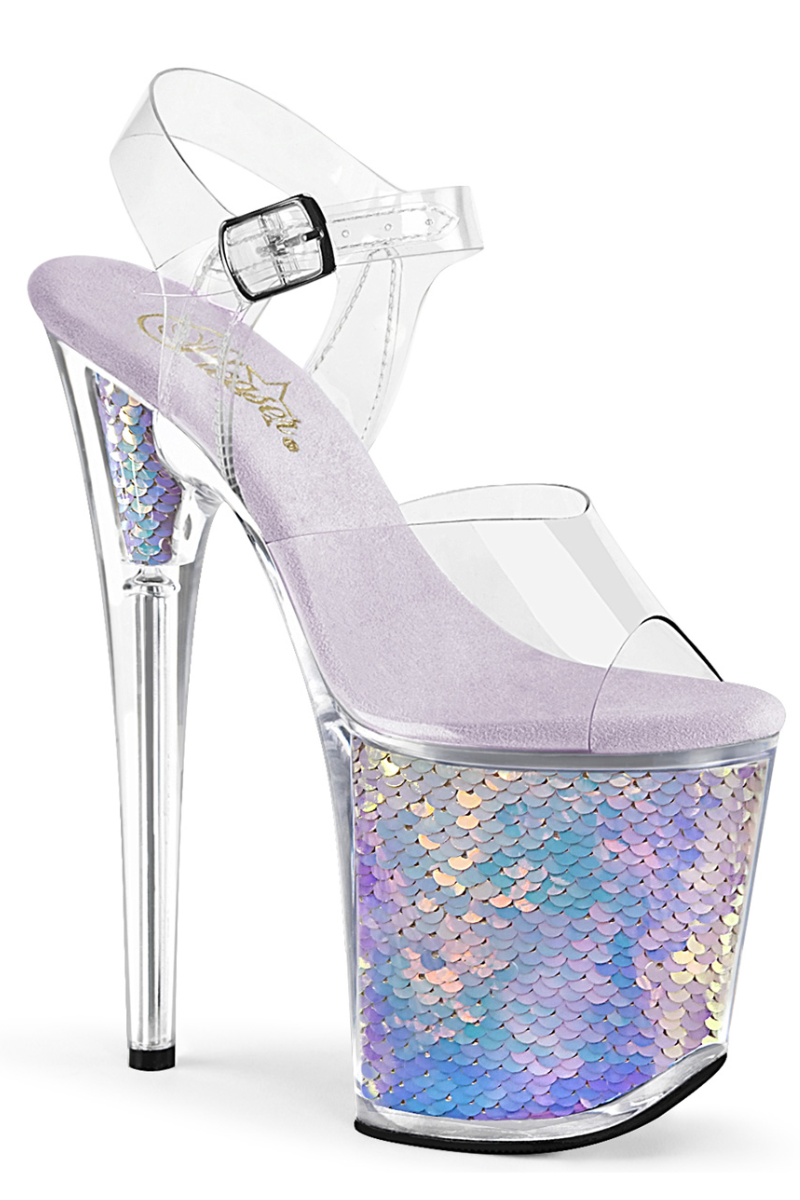 Slay the Stage with Pleaser USA Flamingo-808MC - Mermaid Scales: Feel the ocean's call and own your siren song with these enchanting 8inch Pleasers. 🧜♀️💃 Vegan fab meets mythical glam, featuring a mesmerising mermaid-scale base and clear straps that whisper tales of the deep. Elevate your allure and dance like the world's watching. #MermaidGoddess 🌊✨