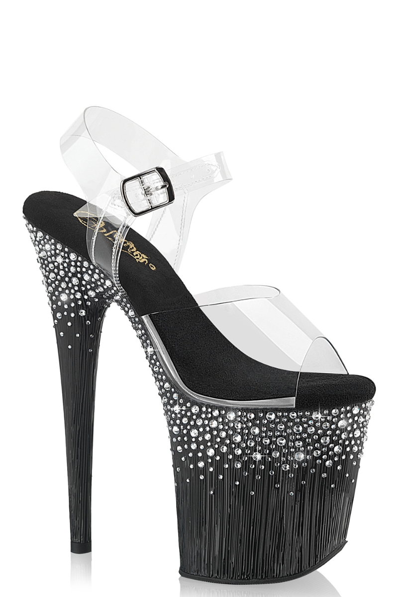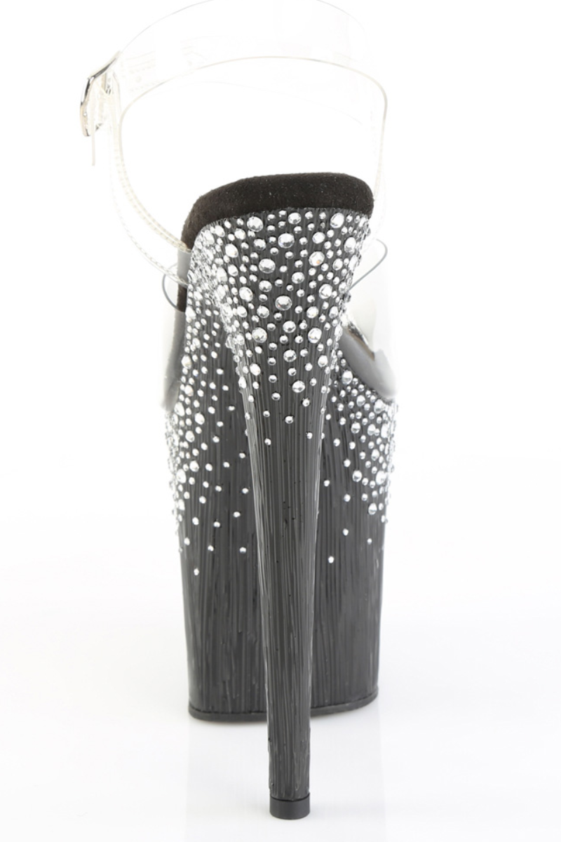 Serve midnight drama with every step. These 8-inch stunners feature a slick patent black base that catches the light with a cascading sprinkle of diamantes, like a starry night for your feet. Secured by a soft, clear TPU upper that vanishes against the skin, they offer invisible support while you steal the spotlight.