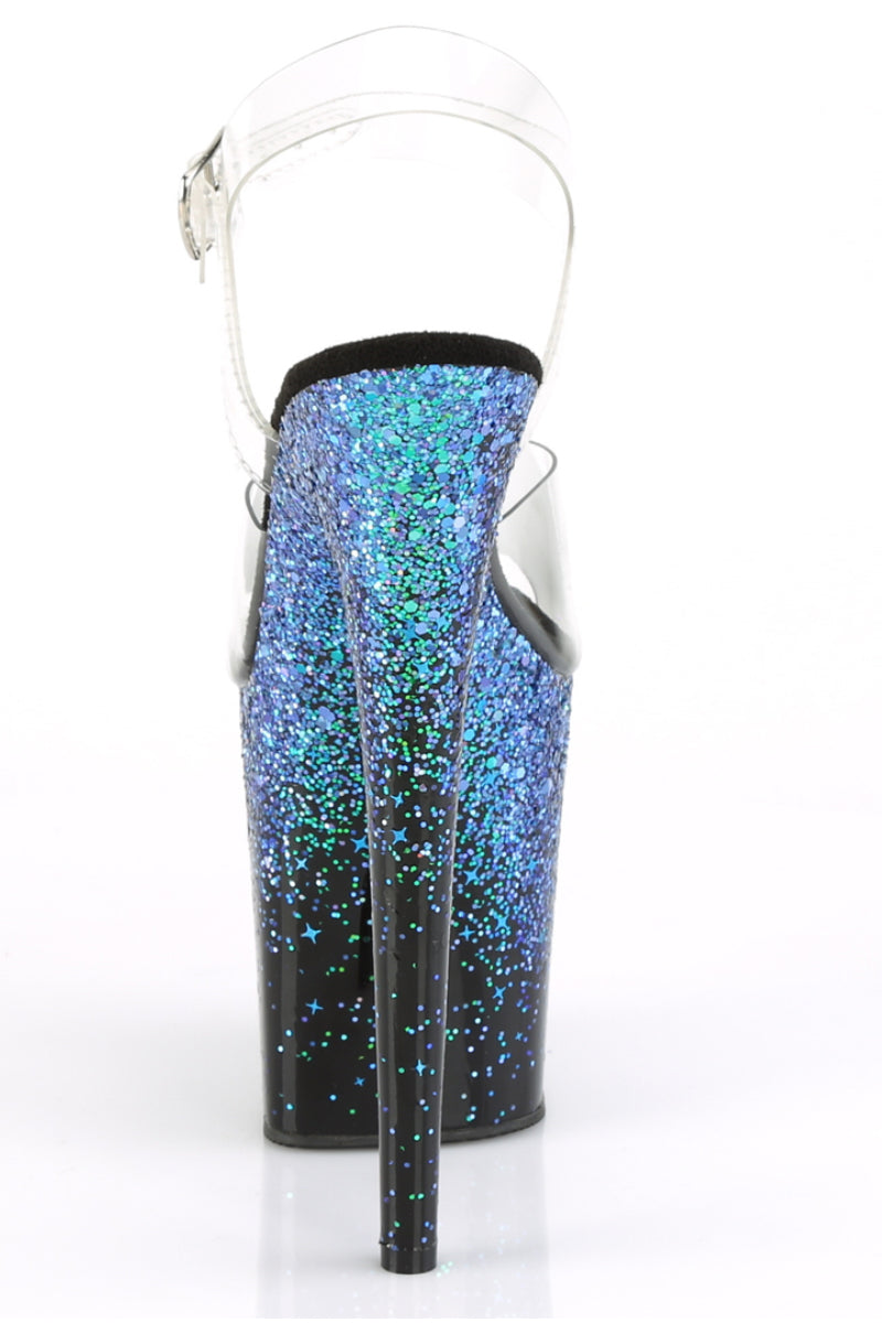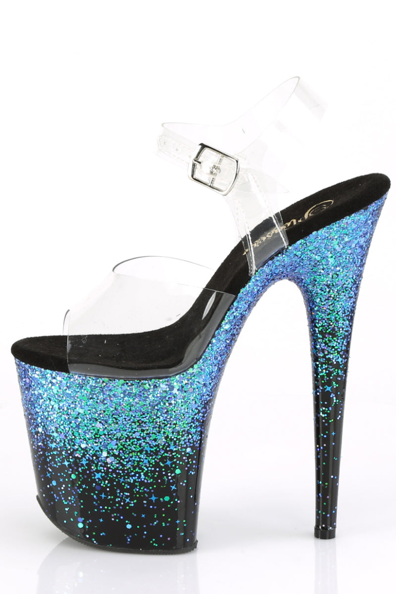 Dare to shimmer in the Pleaser USA Flamingo-808SS 8inch Pleasers - Black/Blue Glitter; an 8-inch heel and 4-inch platform adorned with holographic and ombre glitter. These heels are your declaration of strength and sparkle on the dance floor.💃🤩