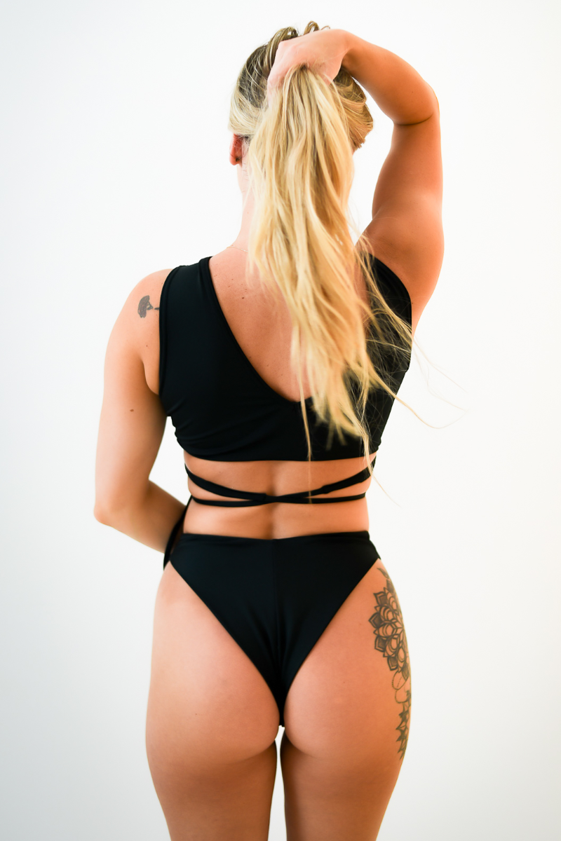 A top that’s anything but one-sided. This supportive piece features a high asymmetric neckline with a playful cut-out. The adjustable waist garter cinches your silhouette, while moisture-wicking fabric keeps you cool. For those who like to play with expectations.