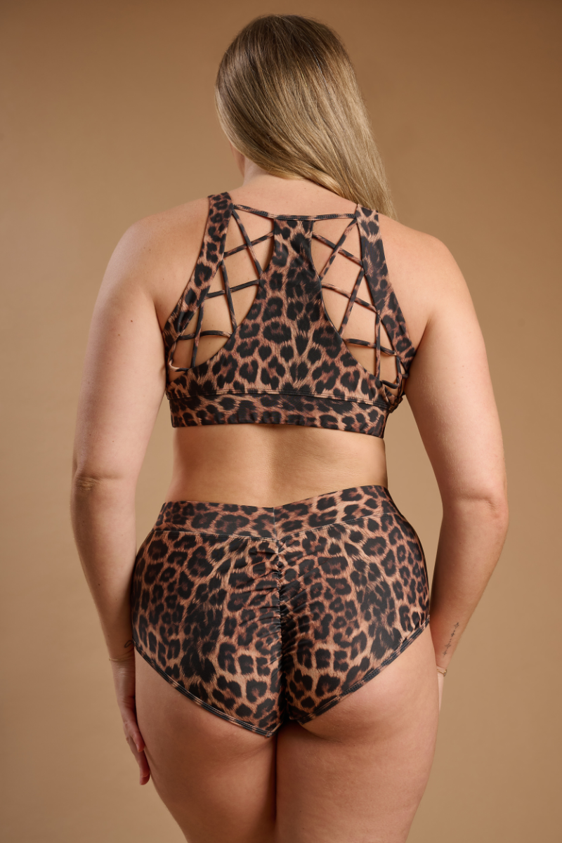 🐾 Feline Fierce Leopard Print 🍑 Irresistible Cheeky Cut ✨ Soft Four-Way Stretch Fabrics ♾️ Built-In Gold Fabric Loops - Attach To Flares For A Custom Fit