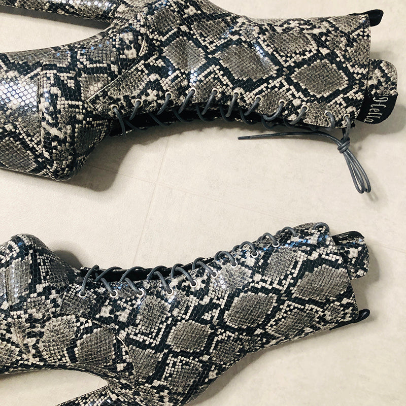The snakeskin material will scuff with floorwork so we recommend you buy some Clear Shoe Protectors. You can barely tell you are wearing them and they will protect your toe boxes and platforms.