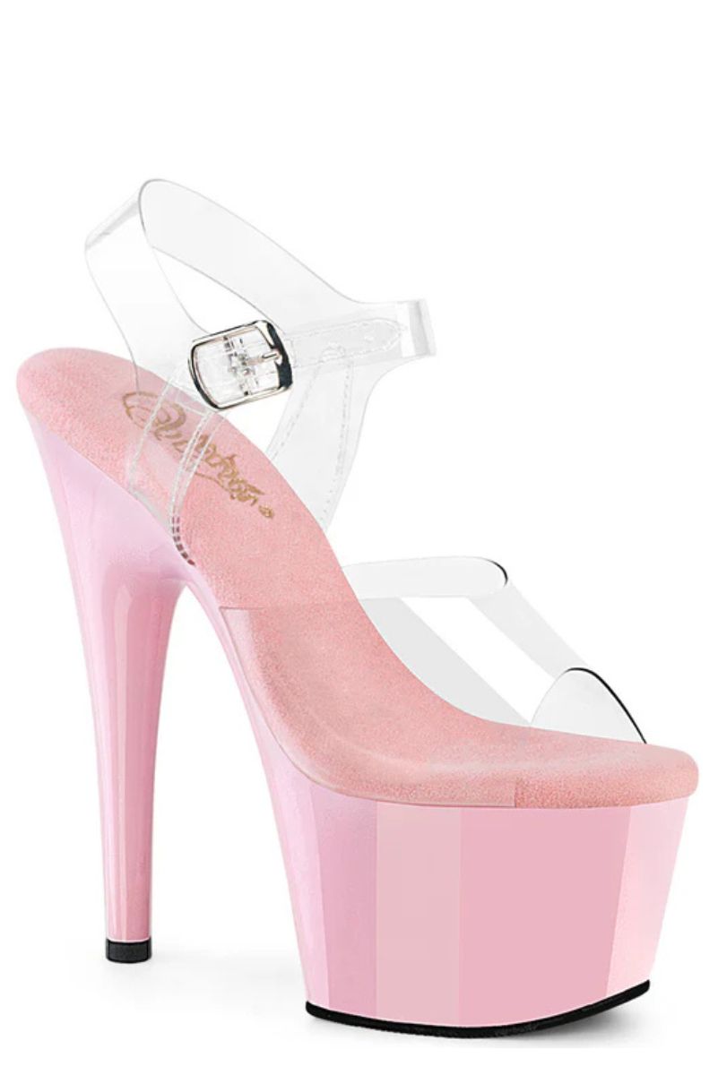 Pleaser USA Adore-708 7inch Pleasers - Baby Pink💕✨ Unleash your fiercest self in the quintessential baby pink. Pleasers every pole dancer needs. With a 2 3/4 inch platform and clear plastic ankle strap atop a glossy baby pink base, these vegan beauties promise to complete any look with a dash of audacity. Lights off, music on, let the studio be your runway.