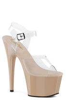 Pleaser USA Adore-708 7inch Pleasers - Beige 💕✨ Unleash your fiercest self in the quintessential Pleasers every pole dancer needs. With a 2 3/4 inch platform and clear plastic ankle strap a top a glossy beige base, these vegan beauties promise to complete any look.