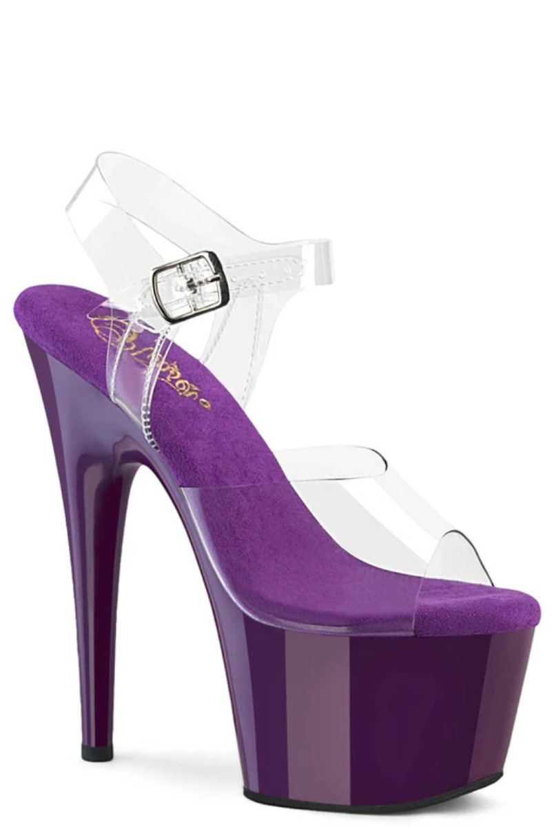 Pleaser USA Adore-708 7inch Pleasers - Purple 💕✨ Unleash your fiercest self in the quintessential purple. Pleasers every pole dancer needs. With a 2 3/4 inch platform and clear plastic ankle strap atop a glossy purple base, these vegan beauties promise to complete any look with a dash of audacity. Lights off, music on, let the studio be your runway.