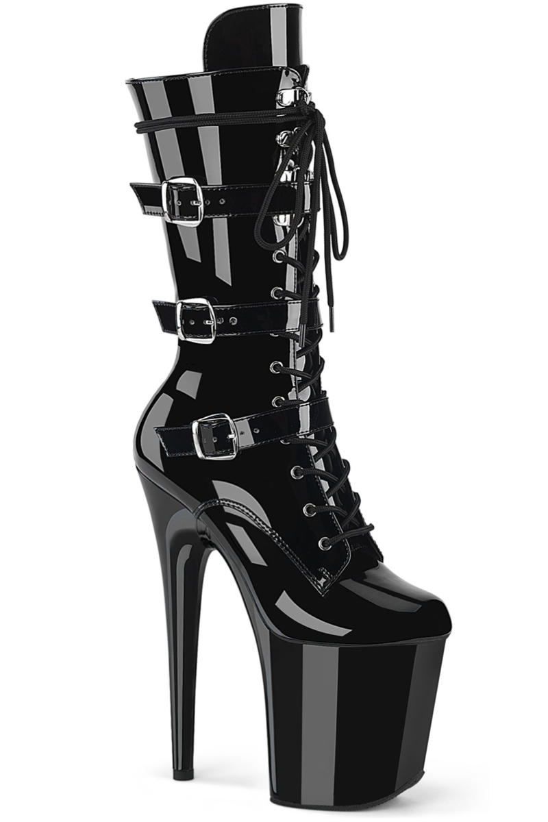 Defy Gravity in Pleaser USA Flamingo-1053 Boots: Lace-up, zip up, and step up in boots that dare you to rise. With a towering 8" heel and a 4" platform, these vegan patent stunners are all about empowering your every move. Detailed with bold buckles and flat eyelet lace-ups, they're not just footwear—they're a statement. Elevate your attitude. Rock the Flamingo-1053.